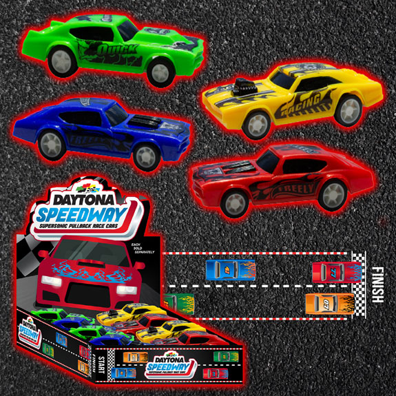 8 Cars per display sold separatley. 3.5" Daytona style pullback race car in 4asst colors.