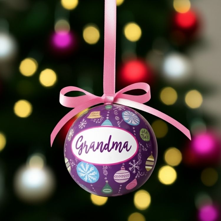 Delight grandmas this holiday season with this beautiful 'Grandma' Christmas ornament. This round, purple ornament features a lovely script design on a white oval, adorned with snowflakes and festive ornaments, finished with a pretty pink ribbon. Perfect for school holiday gift shops, Santa Shops, and fundraising events. A thoughtful and affordable addition to your Grandma Gifts selection!