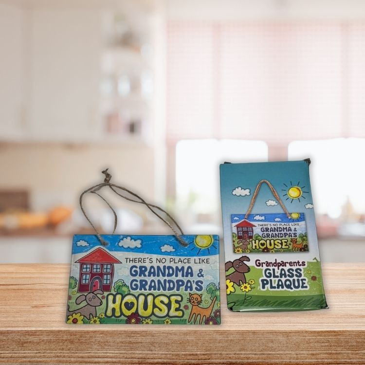 This charming ""There's no place like Grandma and Grandpa's House"" glass plaque makes a heartwarming gift for grandparents. Ideal for school holiday gift shops and fundraising events, this sentimental plaque is a great addition to your selection of Grandma Gifts and Grandpa Gifts. Its sweet message and attractive design make it a popular choice for students looking for a special present for their loved ones. A perfect item for your Santa Shop!