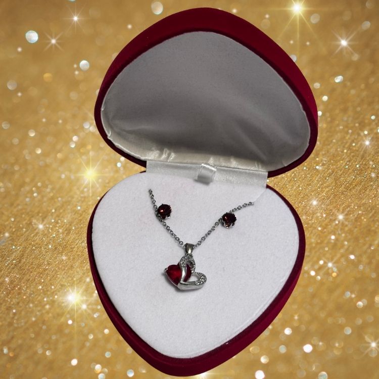 This adorable Heart Pendant Necklace and Earring Set is a perfect jewelry gift for your school's holiday gift shop or Santa Shop! This matching set features a beautiful heart-shaped pendant necklace and coordinating stud earrings. Each piece showcases a red gemstone surrounded by sparkling clear stones, all presented in a charming red heart-shaped box. A wonderful and affordable jewelry gift option for students to purchase for loved ones.