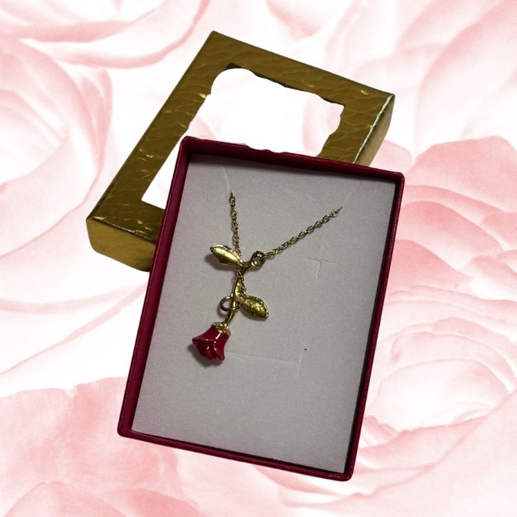 This lovely gold-tone necklace features a delicate red rose pendant and comes in a festive red and gold gift box. It's a beautiful jewelry gift, perfect for your school's holiday gift shop. A charming and affordable selection for students to purchase as a great gift for loved ones!